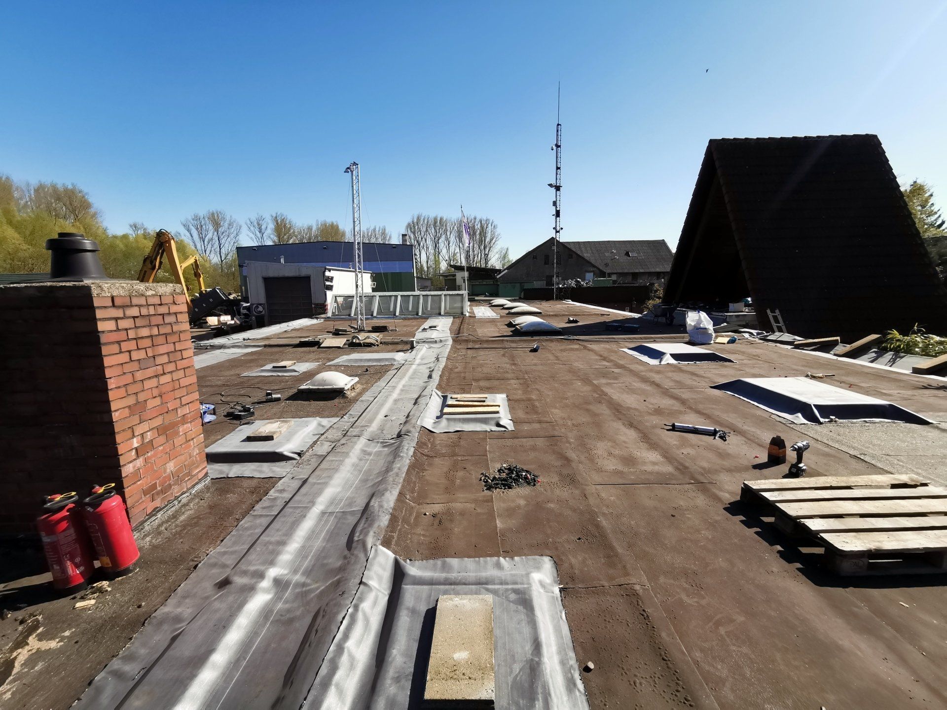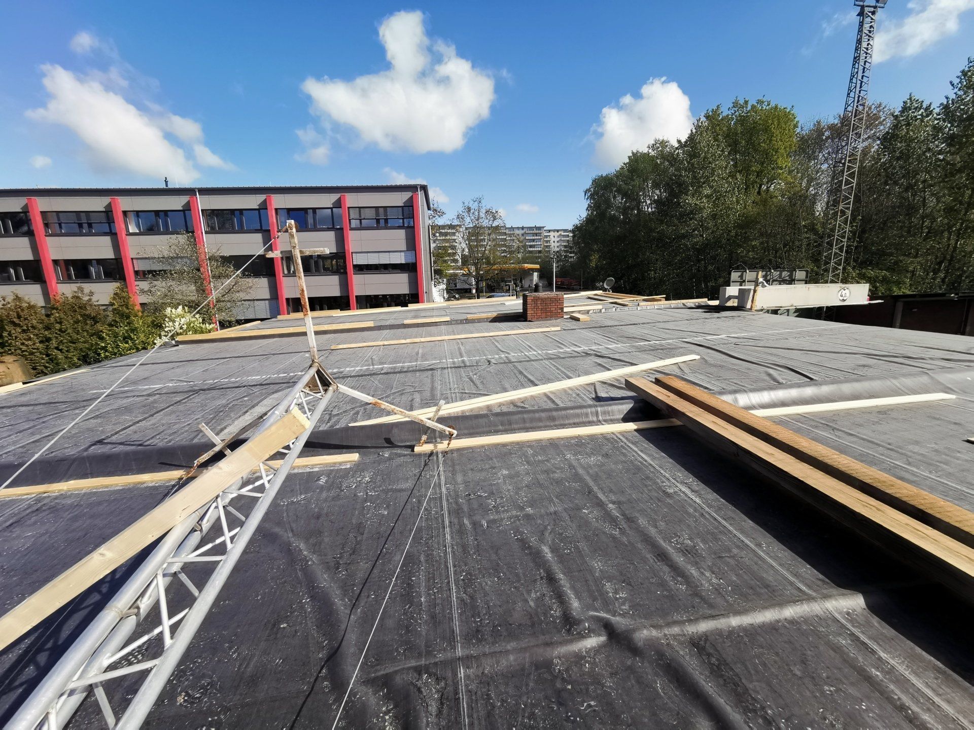 Auf der alten, noch lagesicheren Bitumenabdichtung, wurde die EPDM-Dachbahn mit dem Kleber in der Fläche verklebt. Randbereiche und aufsteigende Bauteile wurden mit einem wasserbasierten Flächenkleber im Kontaktklebeverfahren windsogsicher verklebt.